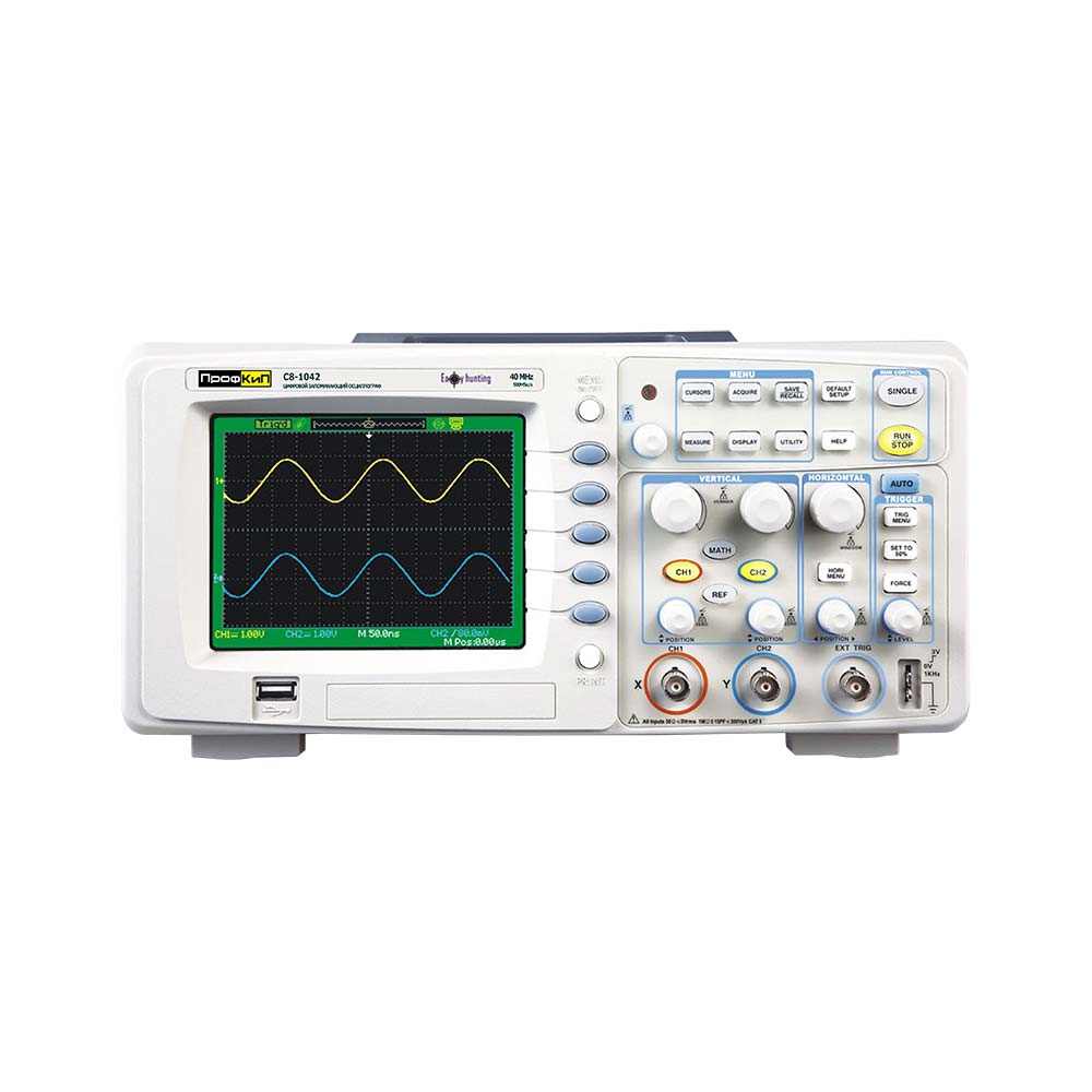 Осциллограф цифровой ПрофКиП С8-1043 имеет цветной ЖКИ экран, меню прибора содержит набор цветовых схем, имеется поддержка русского языка. Органы управления отличаются эргономичностью и имеют удобное расположение. Режимы работы позволяют осуществлять одновременное наблюдение некогерентных сигналов, так же возможно использование различных типов синхронизации.