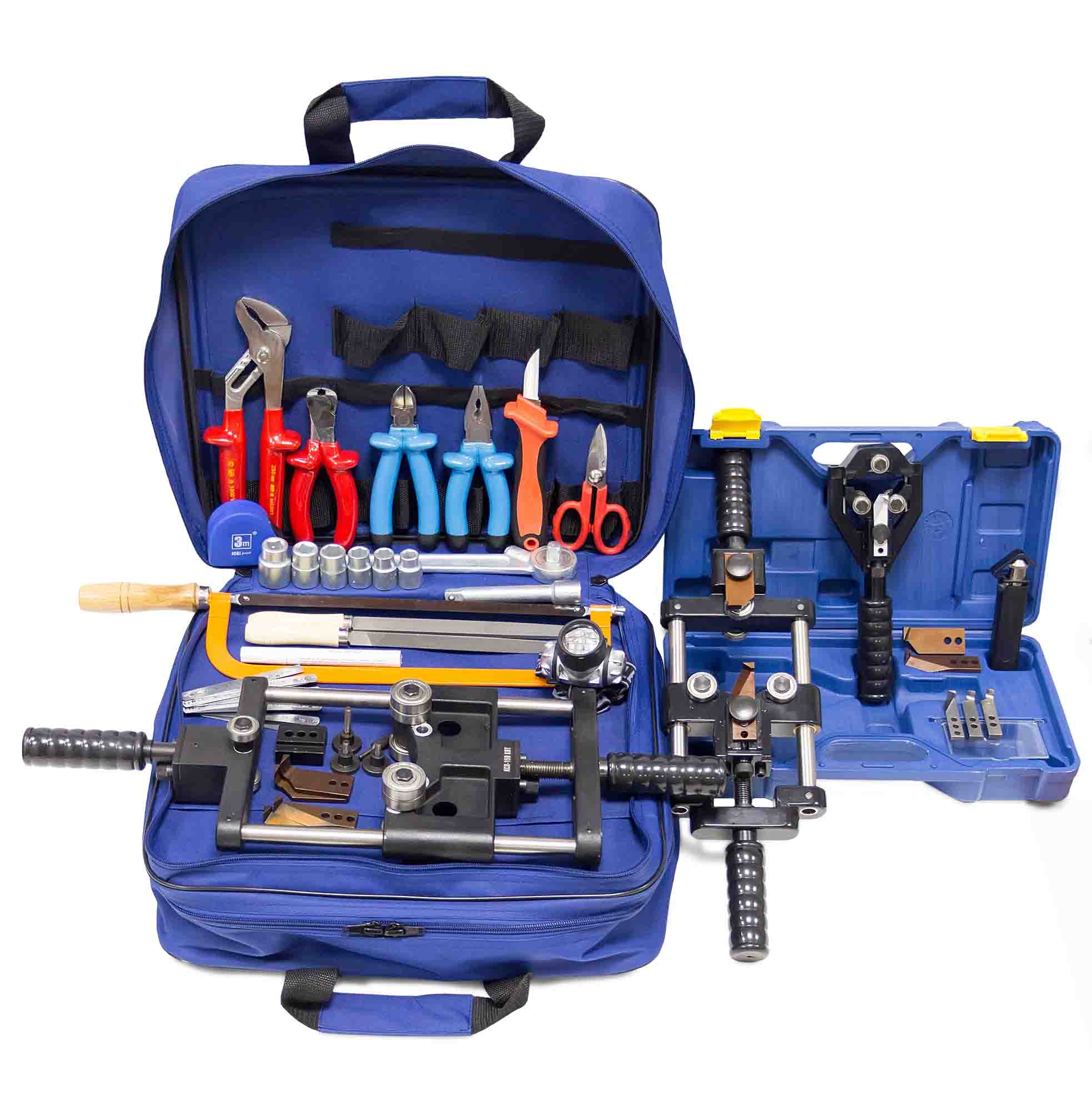 Набор состоит из стрипперов для снятия изоляции, ножниц, изолированных переставных клещей, бокорезов, кусачек, плоскогубцев, торцевых головок, ножовки по металлу, напильников, рулетки.
