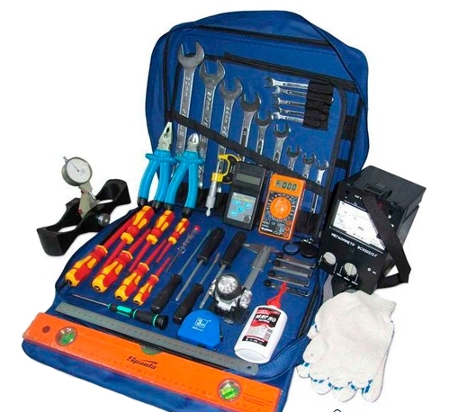 Набор электромеханика состоит из 20 видов инструмента, в том числе изолированных до 1000В плоскогубцев, кусачек и отверток; набора щупов, комплекта ключей, отвертки-спаннер, микрометра, штангенциркуля, уровня, линейки, лупы, масленки, рулетки, налобного фонаря, мультиметра, мегаомметра, толщиномера и динамометра.