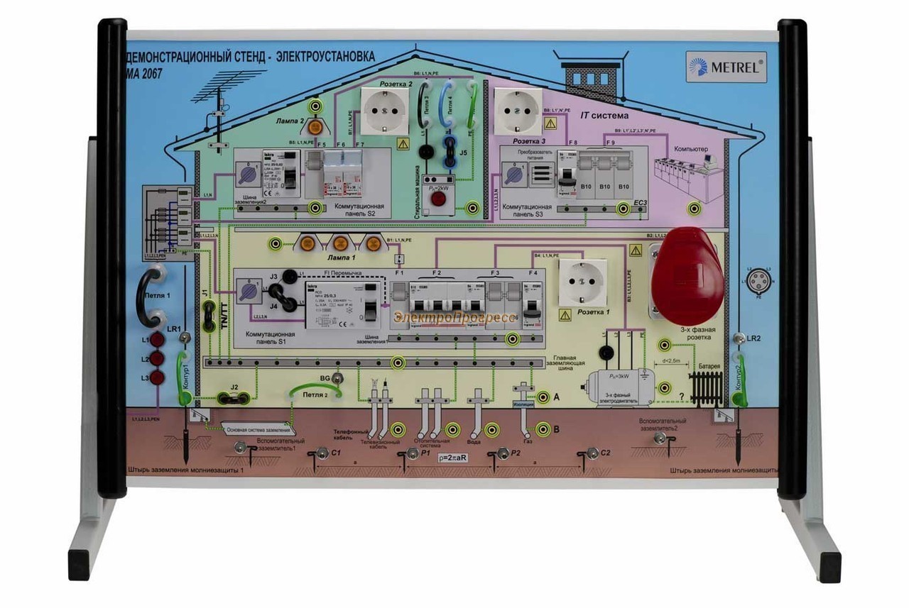 Демонстрационный стенд MA2067 представляет собой уникальную модель электроустановки со всеми присущими ей элементами. Основным предназначением стенда является обучение студентов и слушателей различных учебных заведений навыкам работы в электроустановках до 1000 В. Стенд симулирует все системы электроснабжения (TT, NT, IT) и содержит все необходимые для демонстрации измерений элементы: УЗО, предохранители, трехфазную и однофазную розетки, систему уравнивания потенциалов, систему заземления и молниезащиты и др. Стенд MA 2067 позволяет имитировать различные неисправности и нарушения в электросети, устройствах коммутации и защиты для демонстрации их обнаружения приборами. Демонстрационный стенд отличается наглядностью, удобством и компактностью. Возможность имитировать неисправности позволяет демонстрировать с помощью Demo Board MA2067 работу контрольно-измерительных приборов, что, безусловно, может быть востребовано производителями подобной аппаратуры при проведении презентаций, выставок и других мероприятий.