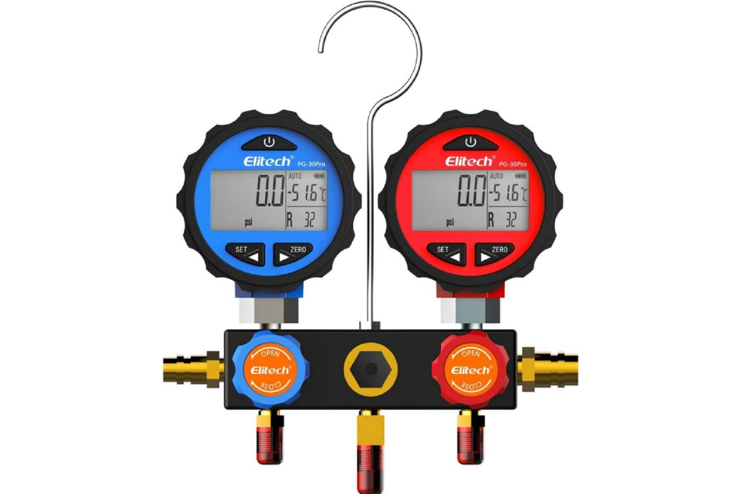Цифровой манометрический коллектор в комплекте с адаптерами Elitech DMG3 используется для вытяжки и сжатия воздуха в холодильной технике и при техническом обслуживании, заправке хладагентом систем кондиционирования воздуха. Он может отображать давление в режиме реального времени на большом экране.